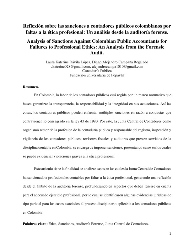 REFLEXIÓN SOBRE LAS SANCIONES A CONTADORES PÚBLICOS COLOMBIANOS POR FALTAS A LA ÉTICA PROFESIONAL: UN ANÁLISIS DESDE LA AUDITORÍA FORENSE
