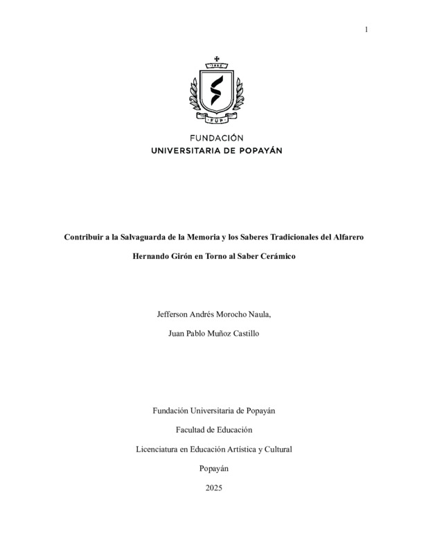 CONTRIBUIR A LA SALVAGUARDA DE LA MEMORIA Y LOS SABERES TRADICIONALES DEL ALFARERO HERNANDO GIRÓN EN TORNO AL SABER CERÁMICO