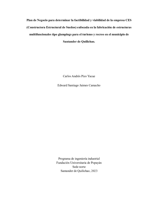 PLAN DE NEGOCIO PARA DETERMINAR LA FACTIBILIDAD Y VIABILIDAD DE LA EMPRESA CES (CONSTRUCTORA ESTRUCTURAL DE SUEÑOS) ENFOCADA EN LA FABRICACIÓN DE ESTRUCTURAS MULTIFUNCIONALES TIPO GLAMPINGS PARA EL TURISMO Y RECREO EN EL MUNICIPIO DE SANTANDER DE QUILICHAO