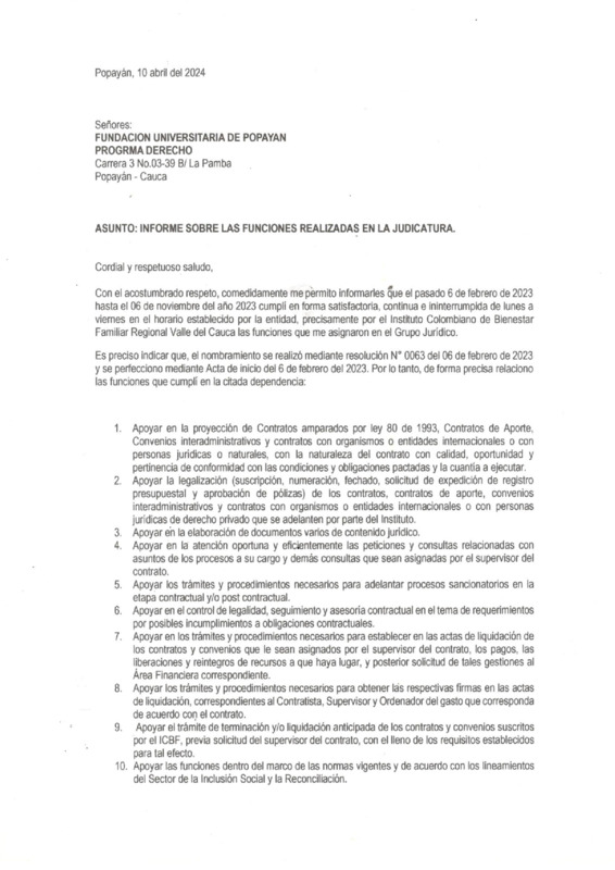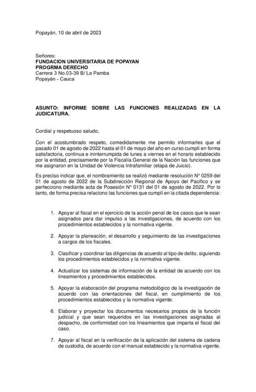 SU SOLICITUD SE BASA EN HABER DESEMPEÑADO EL CARGO DE AUXILIAR JUDICIAL AD-HONOREM EN LA FISCALÍA GENERAL DE LA NACIÓN, FISCALÍA 004 SECCIONAL - UNIDAD DE VIOLENCIA INTRAFAMILIAR DE POPAYÁN - CAUCA, DE CONFORMIDAD CON EL DECRETO 1862 DE 1989 DURANTE EL TIEMPO COMPRENDIDO DEL 1 DE AGOSTO DEL 2022 AL 1 DE MAYO DEL 2023