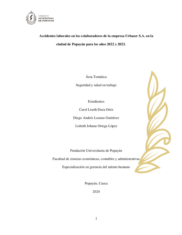 ACCIDENTES LABORALES EN LOS COLABORADORES DE LA EMPRESA URBASER S.A. EN LA CIUDAD DE POPAYÁN PARA LOS AÑOS 2022 Y 2023.