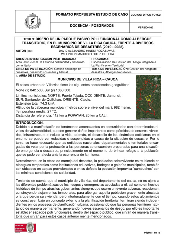 DISEÑO DE UN PARQUE PASIVO POLI FUNCIONAL COMO ALBERGUE TRANSITORIO, EN EL MUNICIPIO DE VILLA RICA CAUCA, FRENTE A DIVERSOS ESCENARIOS DE DESASTRES (2010 - 2022)