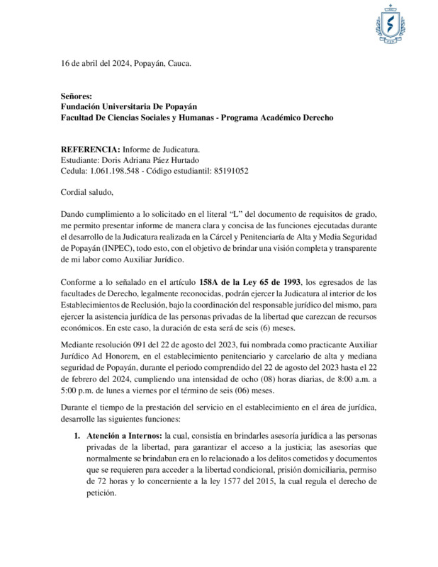 SU SOLICITUD SE BASA EN HABER DESEMPEÑADO EL CARGO DE ASISTENTE JURÍDICO AD-HONOREM DEL DIRECTOR DE LA CÁRCEL Y PENITENCIARÍA CON ALTA Y MEDIA SEGURIDAD DE POPAYÁN, DE CONFORMIDAD CON EL DECRETO 2636 DE 2004. ART. 11, DURANTE EL TIEMPO COMPRENDIDO DEL 22 DE AGOSTO AL 2023 AL 22 DE FEBRERO DE 2024
