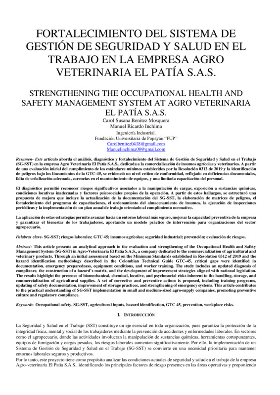 FORTALECIMIENTO DEL SISTEMA DE GESTIÓN DE SEGURIDAD Y SALUD EN EL TRABAJO EN LA EMPRESA AGRO VETERINARIA EL PATÍA S.A.S.
