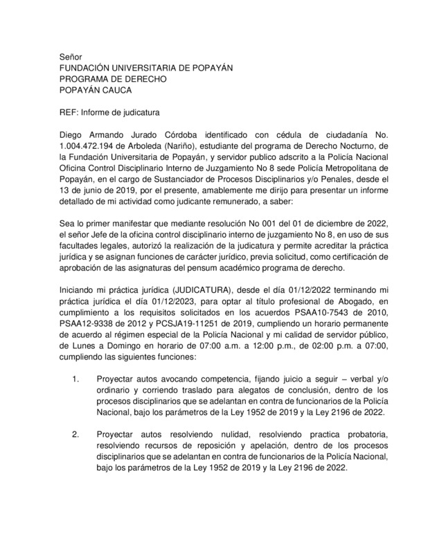 SU SOLICITUD SE BASA EN HABER DESEMPEÑADO FUNCIONES JURÍDICAS EN LA POLICÍA METROPOLITANA DE POPAYÁN OFICINA DE CONTROL DISCIPLINARIO INTERNO DE JUZGAMIENTO No. OCHO DE CONFORMIDAD CON EL DECRETO 3200 DE 1979, ART. 23, NUMERAL 1°, LITERAL G), DURANTE EL TIEMPO COMPRENDIDO DEL 1 DE DICIEMBRE DEL 2022 AL 1 DE DICIEMBRE DEL 2023.