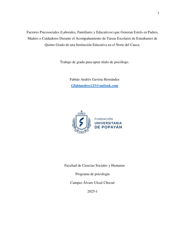 FACTORES PSICOSOCIALES (LABORALES, FAMILIARES Y EDUCATIVOS) QUE GENERAN ESTRÉS EN PADRES, MADRES O CUIDADORES DURANTE EL ACOMPAÑAMIENTO DE TAREAS ESCOLARES DE ESTUDIANTES DE QUINTO GRADO DE UNA INSTITUCIÓN EDUCATIVA EN EL NORTE DEL CAUCA