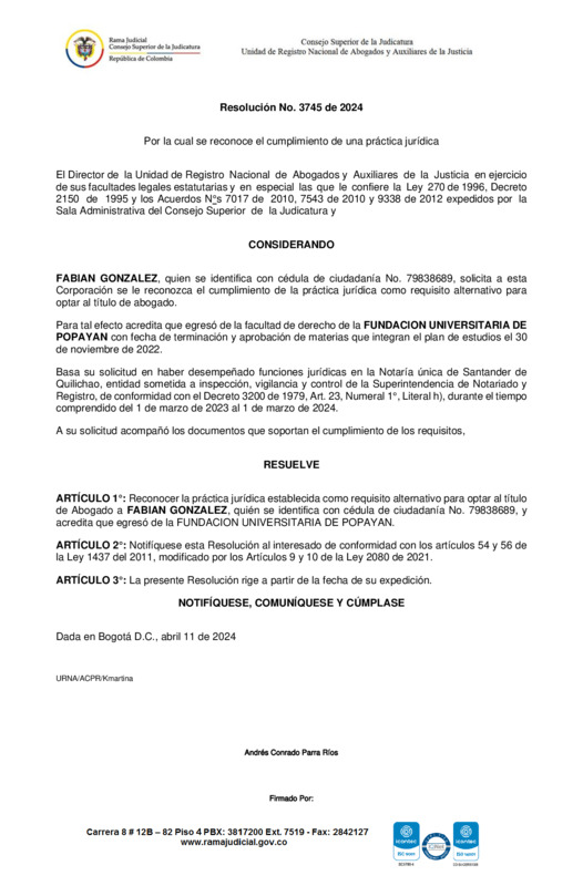 HABER DESEMPEÑADO FUNCIONES JURÍDICAS EN LA NOTARÍA ÚNICA DE SANTANDER DE QUILICHAO, ENTIDAD SOMETIDA A INSPECCIÓN, VIGILANCIA Y CONTROL DE LA SUPERINTENDENCIA DE NOTARIADO Y REGISTRO, DE CONFORMIDAD CON EL DECRETO 3200 DE 1979, ART. 23, NUMERAL 1°, LITERAL H), DURANTE EL TIEMPO COMPRENDIDO DEL 1 DE MARZO DE 2023 AL 1 DE MARZO DE 2024