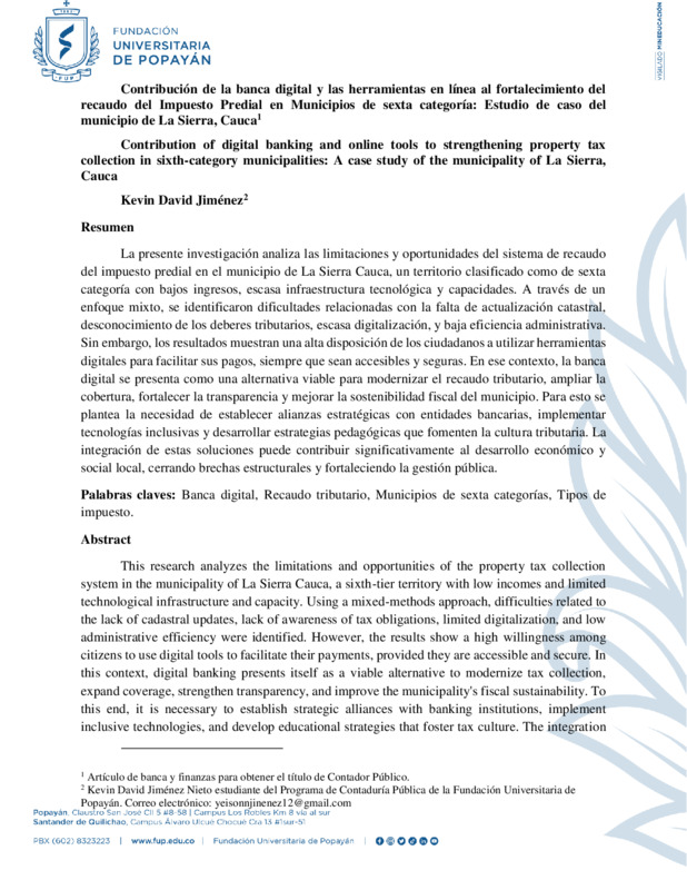 CONTRIBUCIÓN DE LA BANCA DIGITAL Y LAS HERRAMIENTAS EN LÍNEA AL FORTALECIMIENTO DEL RECAUDO DEL IMPUESTO PREDIAL EN MUNICIPIOS DE SEXTA CATEGORÍA: ESTUDIO DE CASO DEL MUNICIPIO DE LA SIERRA, CAUCA
