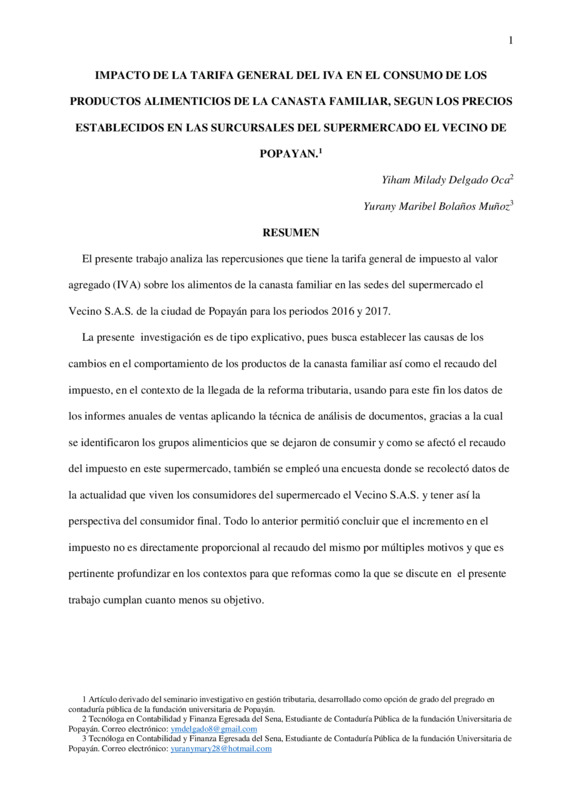 IMPACTO DE LA TARIFA GENERAL DEL IVA EN EL CONSUMO DE LOS PRODUCTOS ALIMENTICIOS DE LA CANASTA FAMILIAR, SEGUN LOS PRECIOS ESTABLECIDOS EN LAS SURCURSALES DEL SUPERMERCADO EL VECINO DE POPAYAN