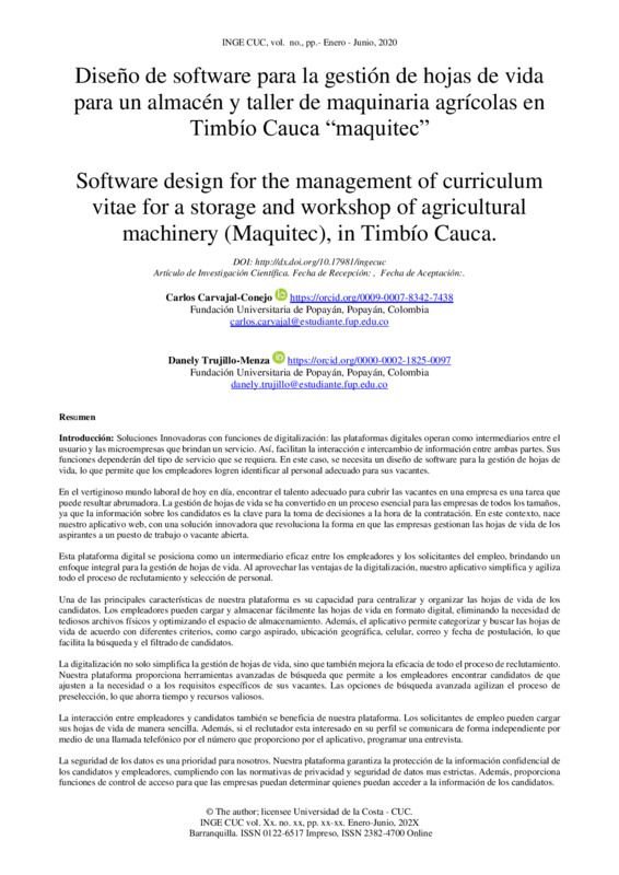 DISEÑO DE SOFTWARE PARA LA GESTIÓN DE HOJAS DE VIDA PARA UN ALMACÉN Y TALLER DE MAQUINARIA AGRÍCOLAS EN TIMBÍO CAUCA “MAQUITEC”