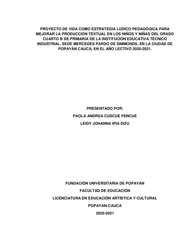 Parte de PROYECTO DE VIDA COMO ESTRATEGIA LÚDICO-PEDAGÓGICA PARA MEJORAR LA PRODUCCIÓN TEXTUAL EN LOS NIÑOS Y NIÑAS DEL GRADO 4B DE PRIMARIA DE LA INSTITUCIÓN EDUCATIVA TÉCNICO INDUSTRIAL, SEDE MERCEDES PARDO DE SIMMONDS, EN LA CIUDAD DE POPAYÁN CAUCA, EN EL AÑO ELECTIVO 2020