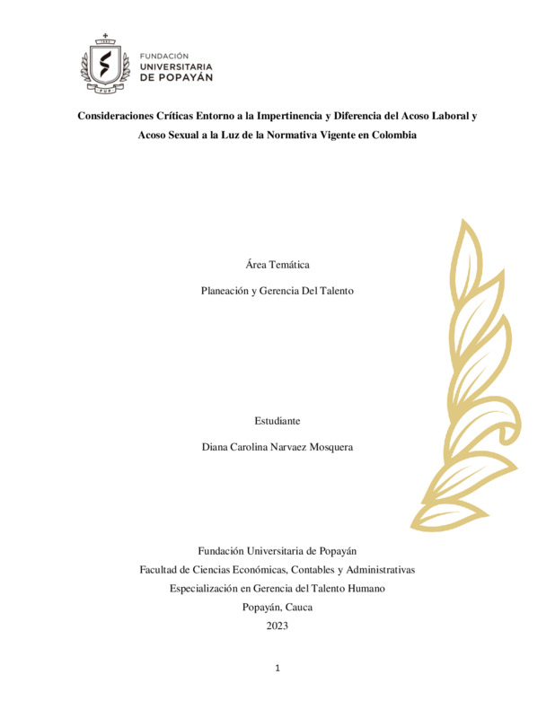 Parte de CONSIDERACIONES CRÍTICAS ENTORNOA LA IMPERTINENCIA Y DIFERENCIA DEL ACOSO LABORAL Y ACOSO SEXUAL A LA LUZ DE LA NORMATIVA VIGENTE EN COLOMBIA