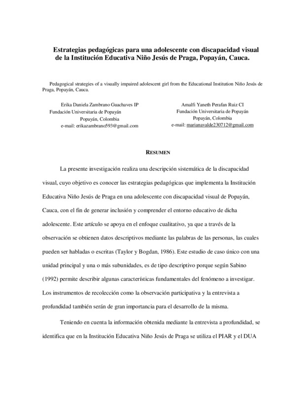 Parte de ESTRATEGIAS PEDAGÓGICAS PARA UNA ADOLESCENTE CON DISCAPACIDAD VISUAL DE LA INSTITUCIÓN EDUCATIVA NIÑO JESÚS DE PRAGA, POPAYÁN, CAUCA.